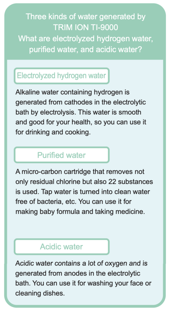 It is said that the water is the origin of life. Without water, life would not have been able to survive and evolve, and life would not have arisen on Earth 3.5 billion years ago. Water is the most important thing for living creatures. However, water in the ancient times that gave birth to, nurtured, and evolved life would not have contained any artificially synthesized chemicals like it does today. Continuous generation type hydrogen water ionizer TRIM ION TI-9000 cleans tap water by removing chlorine and other substances with a large water purifier and then uses electrolysis to generate alkaline water containing hydrogen. Enliven your life with Trim’s electrolyzed hydrogen water.