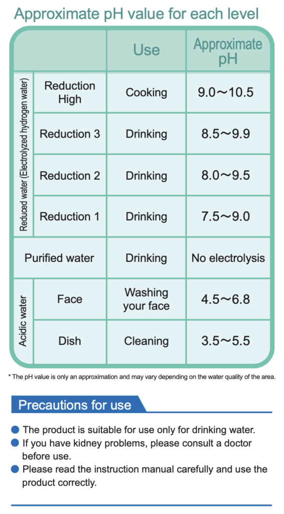 - Alkaline Water (multiple levels): Intended for drinking and cooking (recognized in Japan for improving gastrointestinal conditions).
